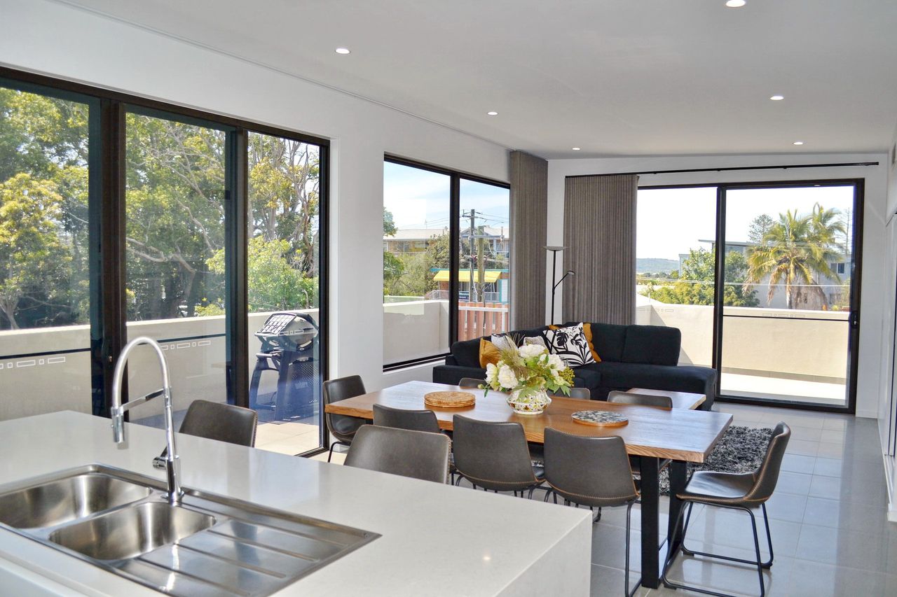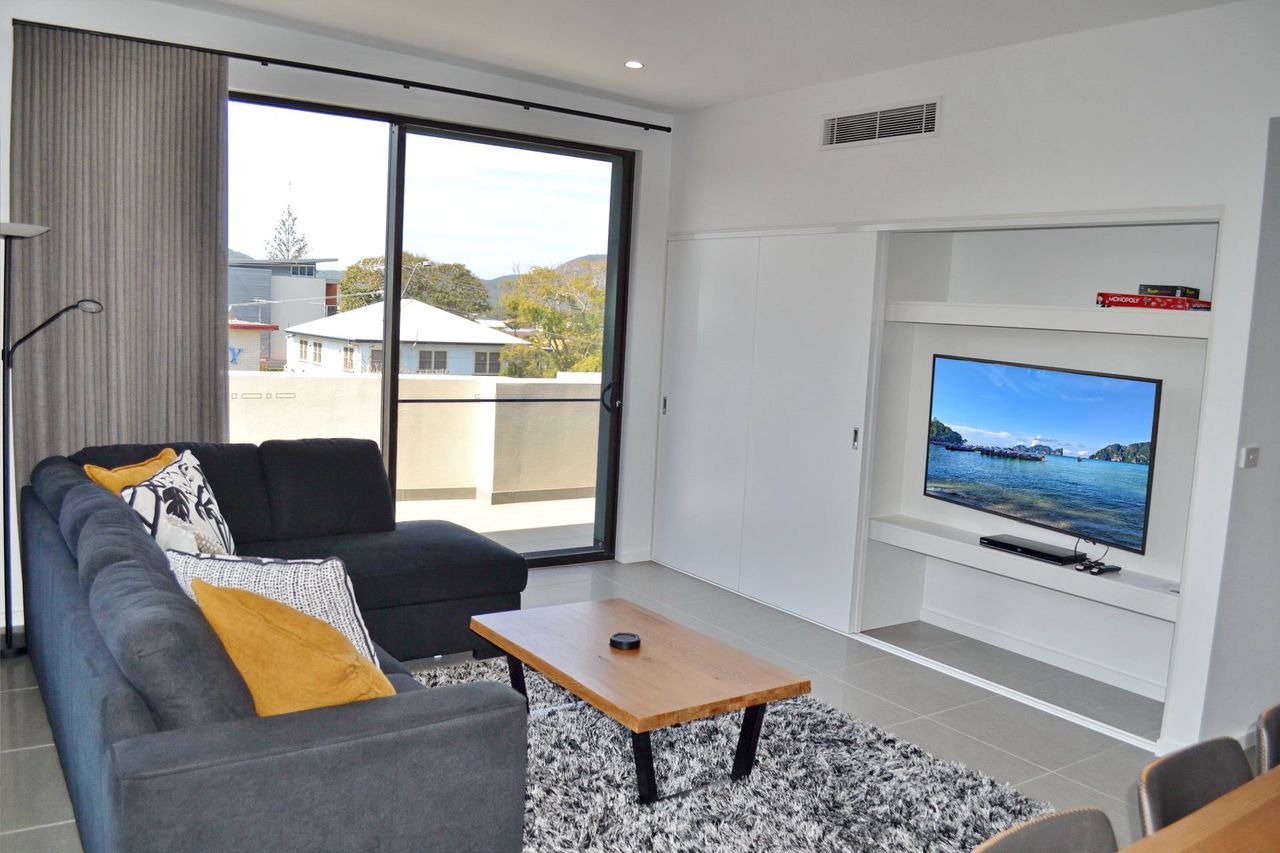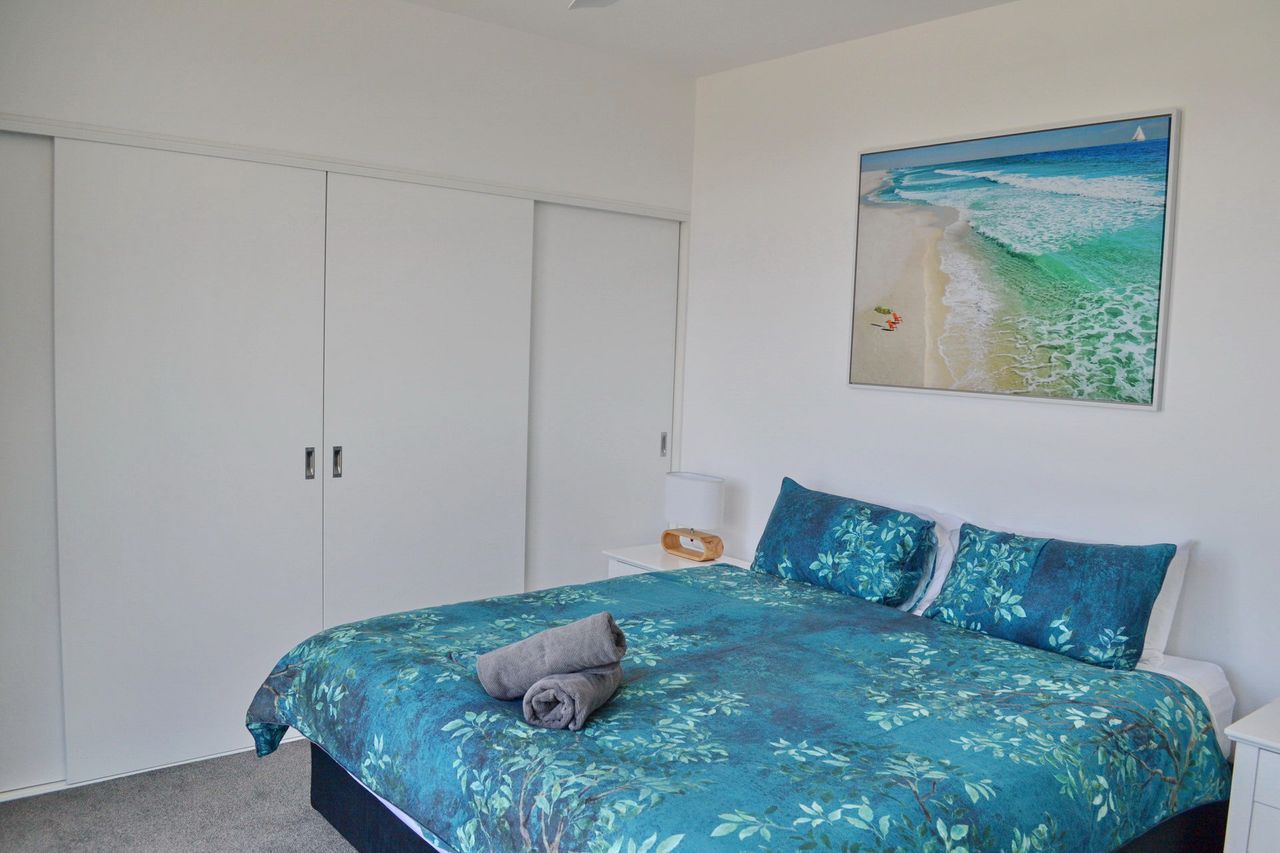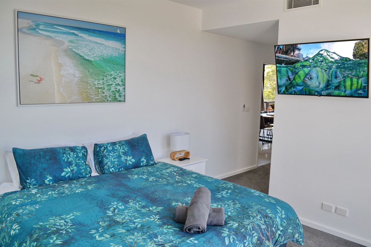 Inside, the open-plan living, dining, and kitchen area features a dishwasher, Wi-Fi, a large flat-screen TV, and a DVD player. The main bedroom includes an ensuite bathroom and an additional wall-mounted TV. The apartment also offers a private laundry with a washer and dryer. Convenient lift access is available from two spaces in the secure underground car park, which includes a lock-up cage suitable for beach gear, bicycles, or even a kayak. Park your car upon arrival and enjoy walking to nearby shops, restaurants, beautiful beaches, or a refreshing swim at Back Creek.