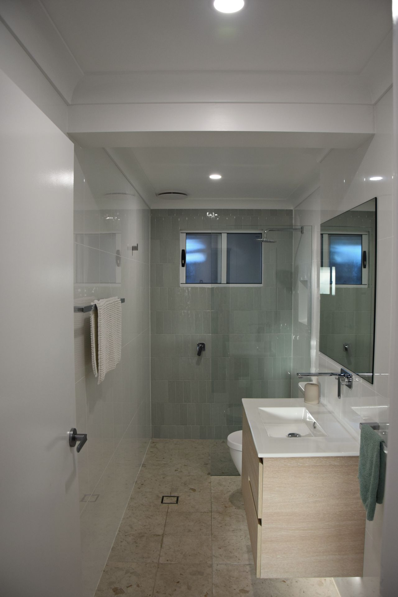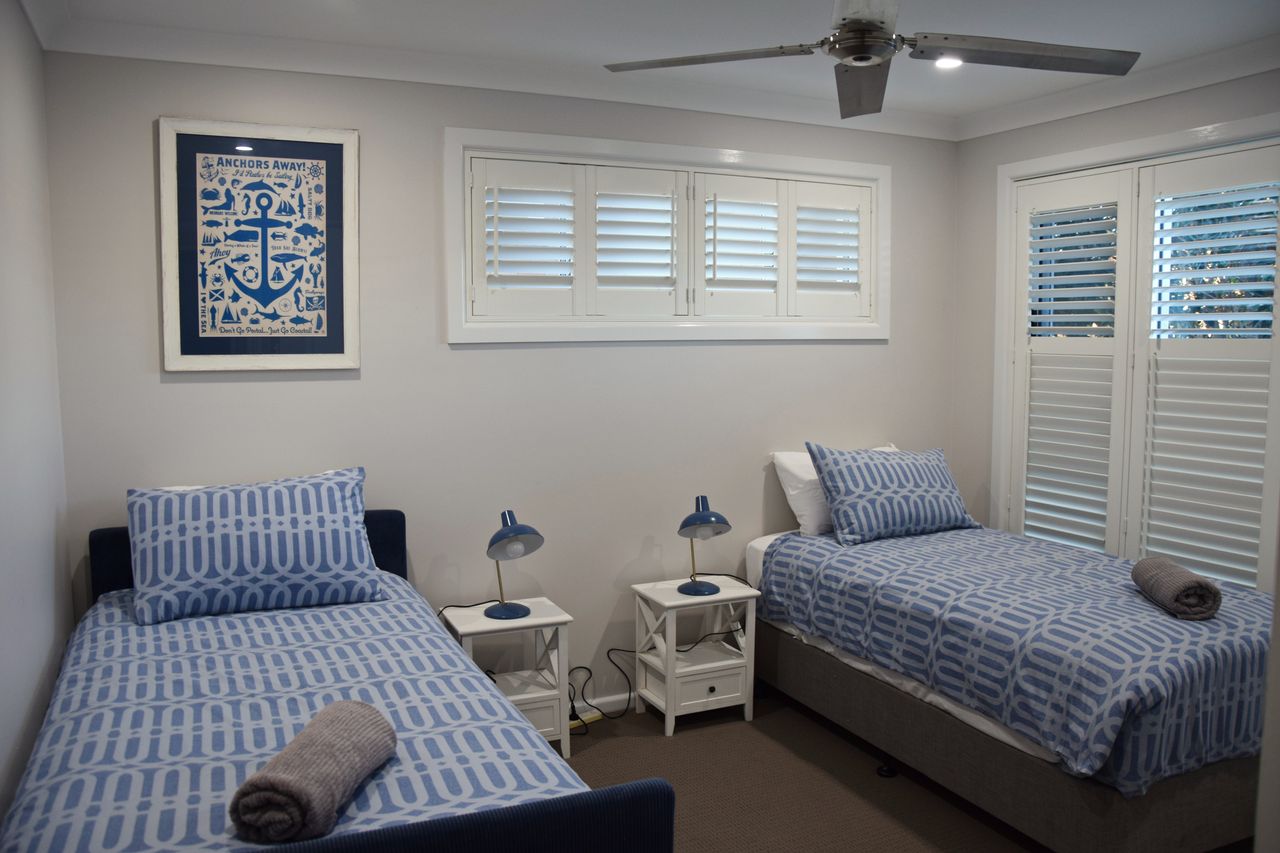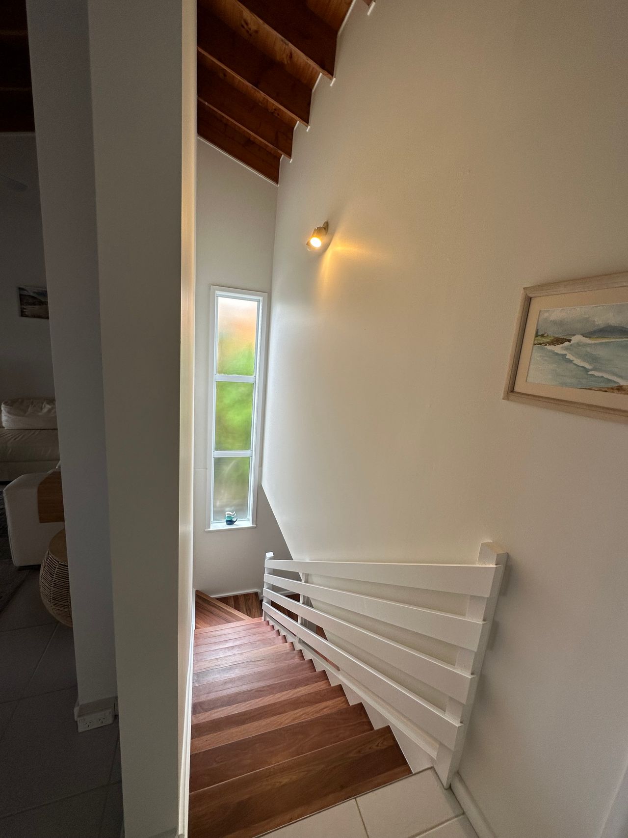The home boasts 4 stylish bedrooms, all with ceiling fans and plantation shutters. There are 2 bedrooms upstairs, one with a king bed and the second with 2 singles. Downstairs also has 2 bedrooms one with a queen bed and the other with 2 singles. All the bedrooms feature new beds with quality linen and plenty of hanging space.