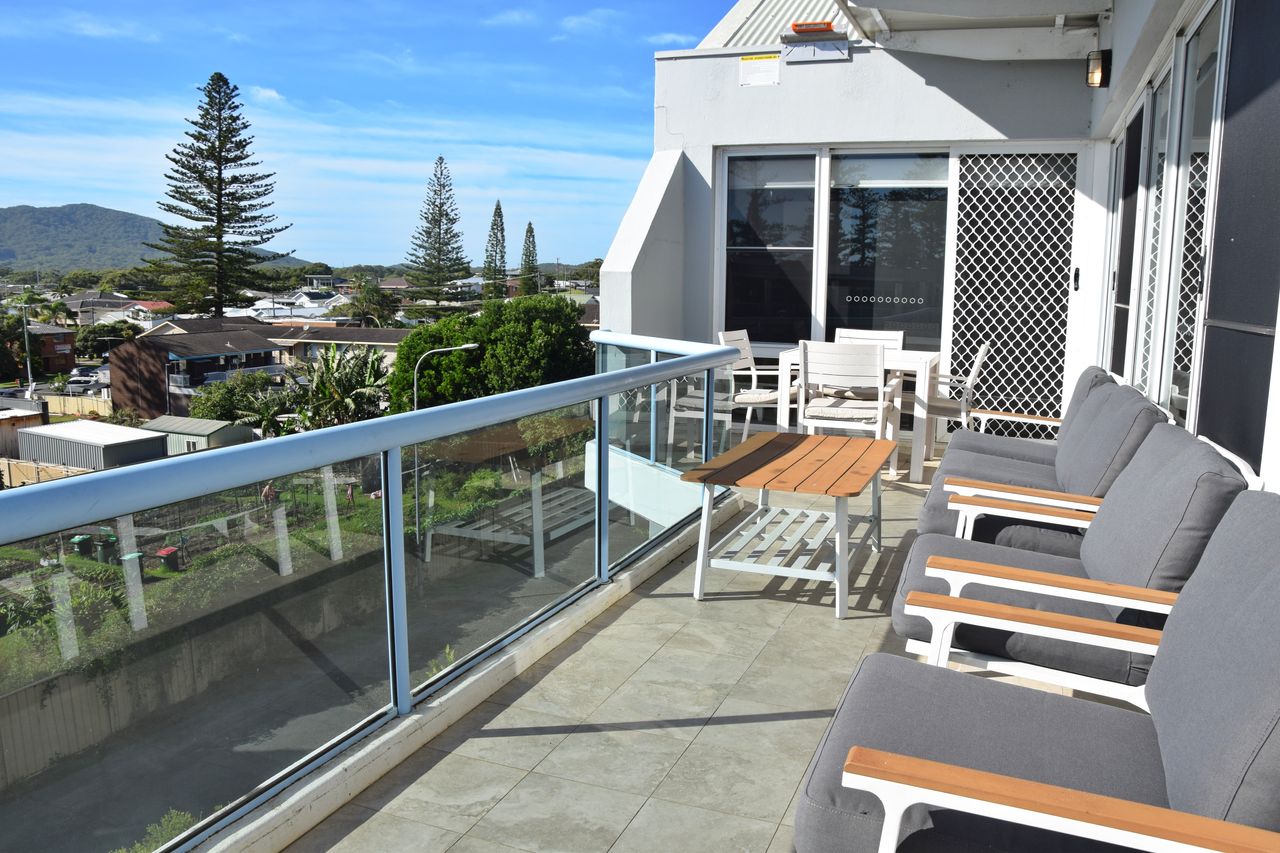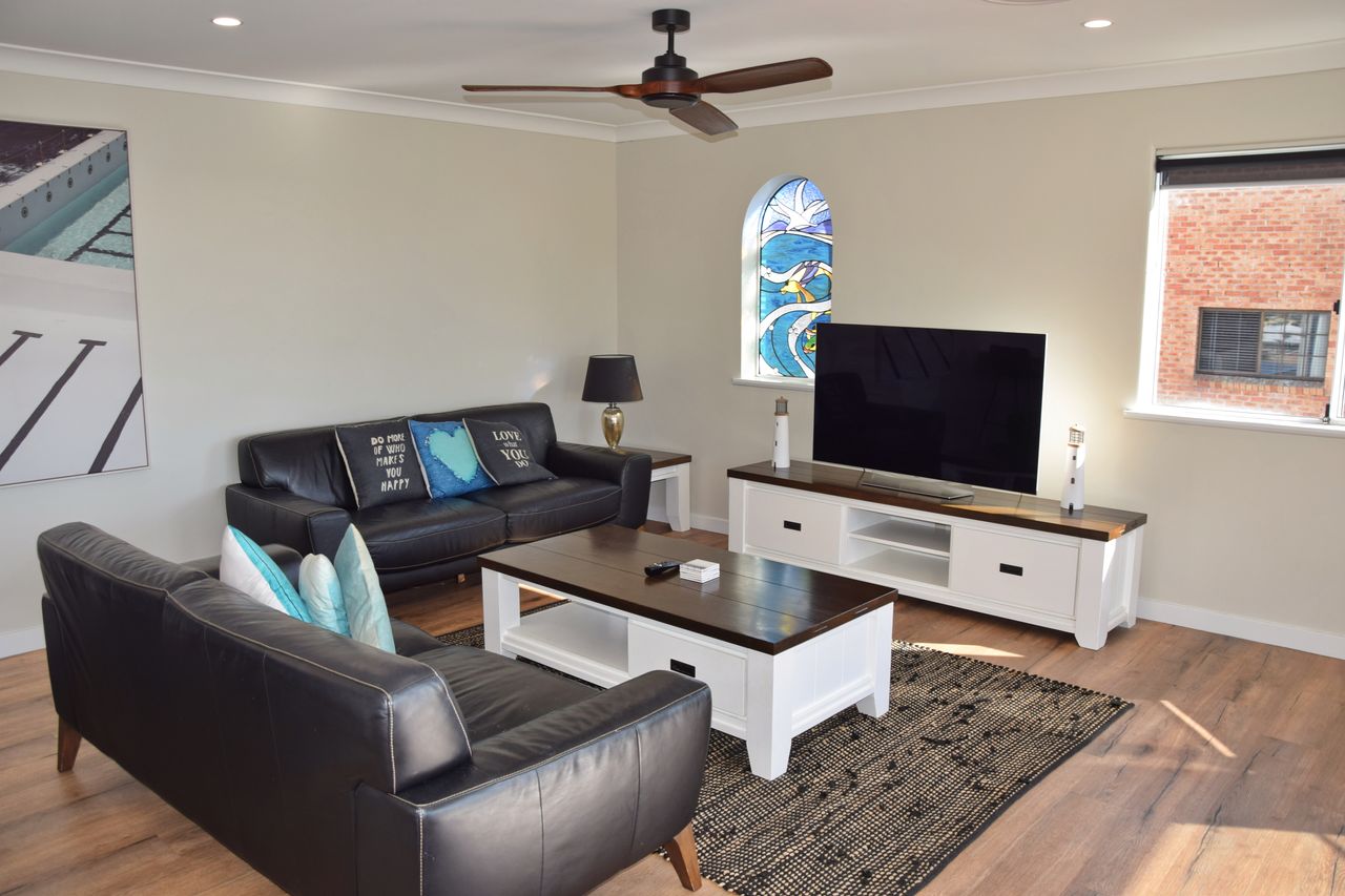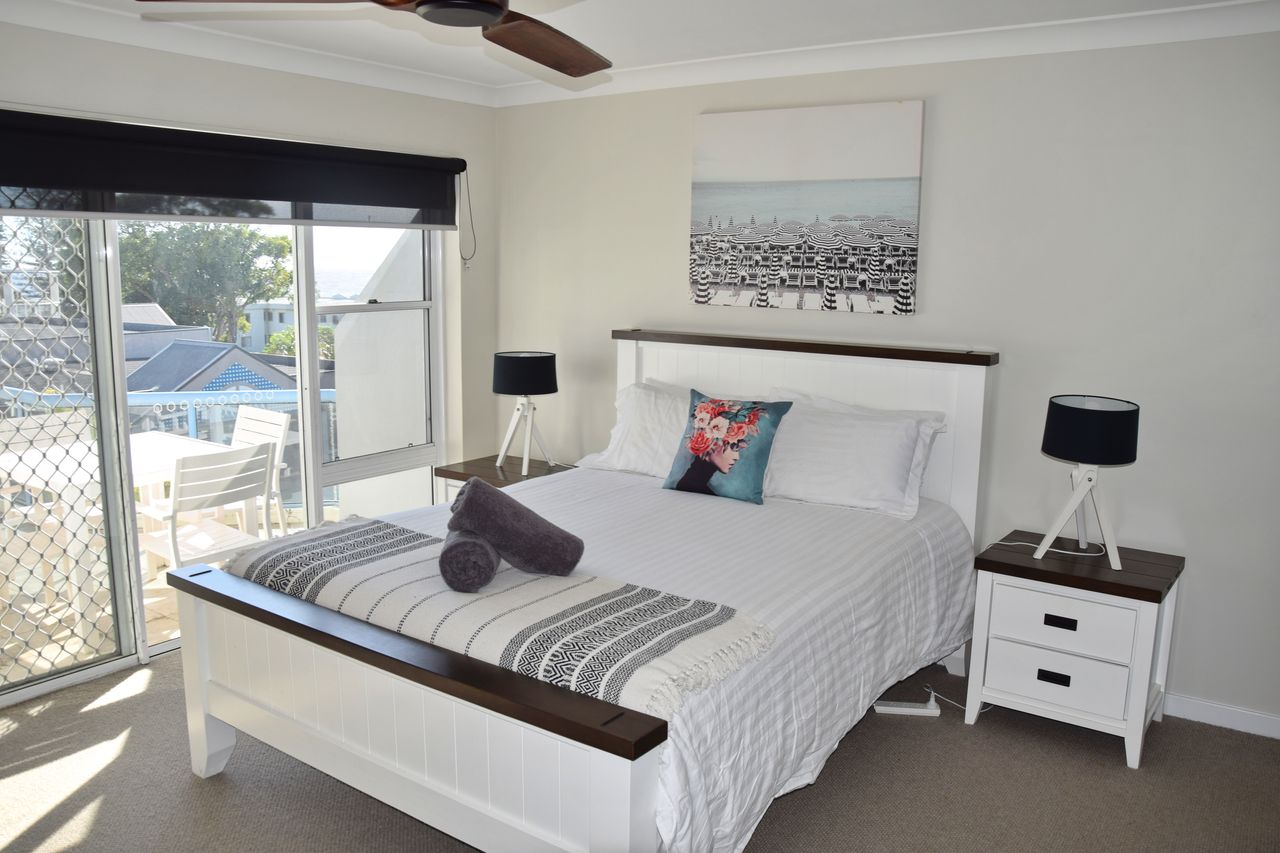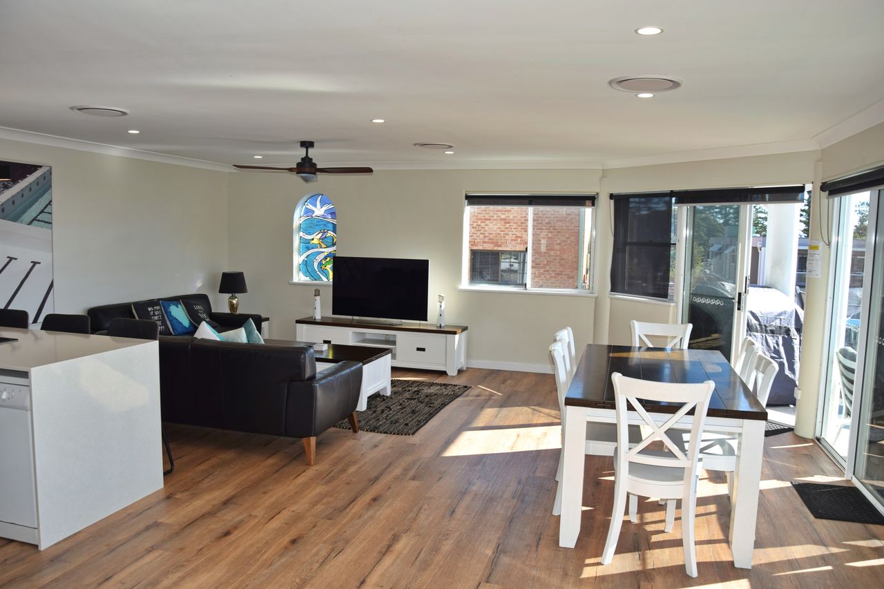 This stunningly renovated three-bedroom penthouse apartment offers a sophisticated modern aesthetic and a prime location in the heart of town. The open-plan living, dining, and kitchen area features sleek modern appliances, creating a perfect space for relaxation and entertaining. Each bedroom is appointed with a luxurious queen bed, while the new ensuite and main bathroom add a touch of elegance. Freshly updated with new flooring and blinds throughout, this immaculate apartment also includes air-conditioning and Wi-Fi for your comfort. Step out onto the expansive balcony, complete with shade awnings, an outdoor dining setting, and a gas BBQ, where you can enjoy breathtaking views of the town centre, Trial Bay, and Arakoon.