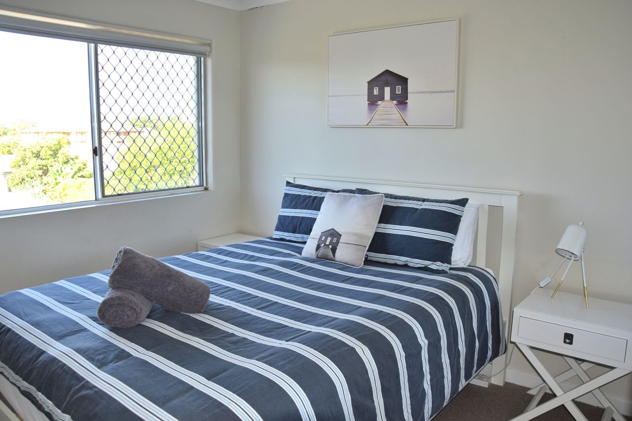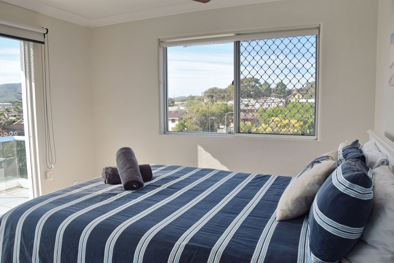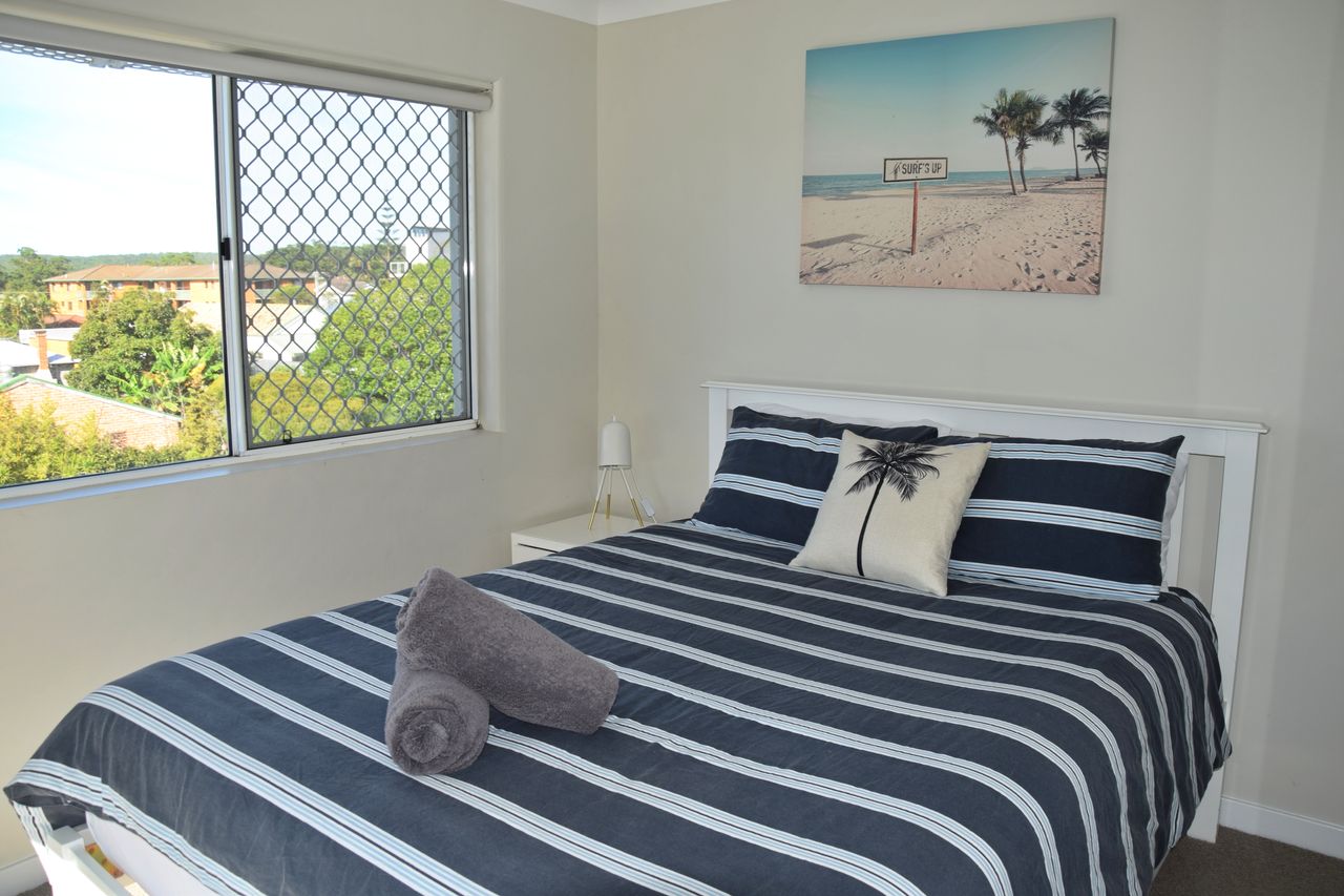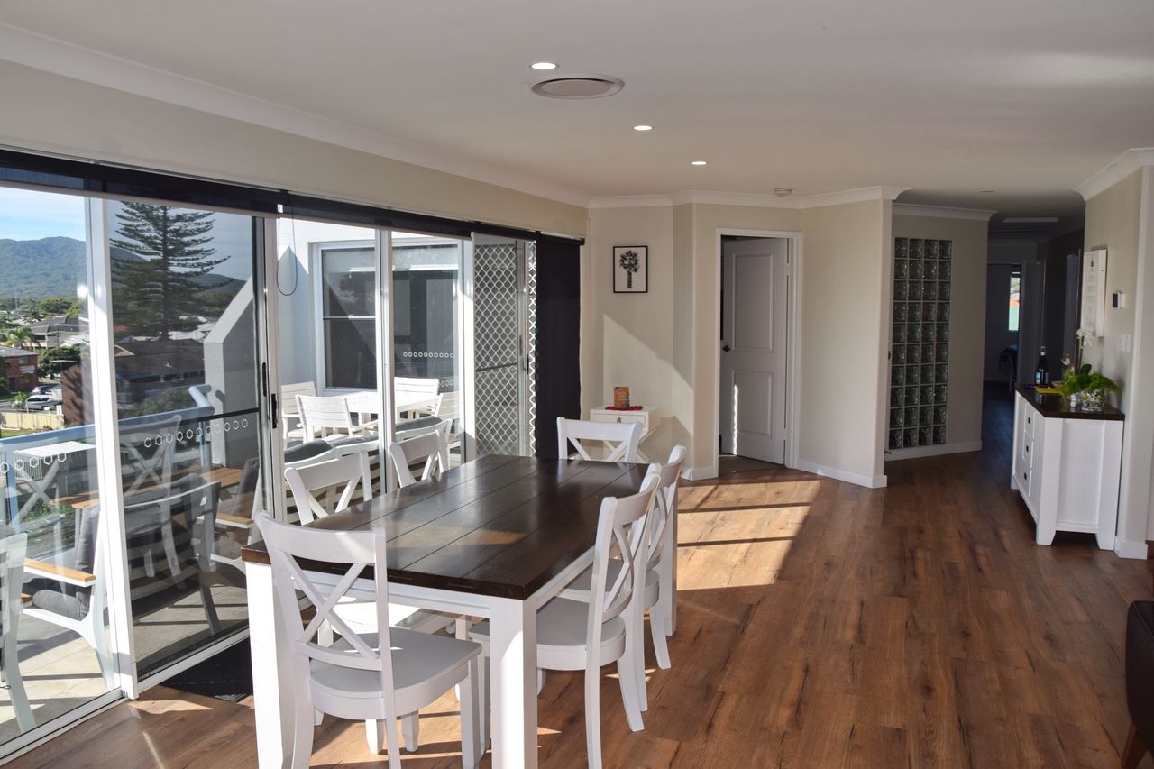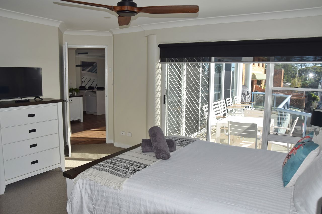 This stunningly renovated three-bedroom penthouse apartment offers a sophisticated modern aesthetic and a prime location in the heart of town. The open-plan living, dining, and kitchen area features sleek modern appliances, creating a perfect space for relaxation and entertaining. Each bedroom is appointed with a luxurious queen bed, while the new ensuite and main bathroom add a touch of elegance. Freshly updated with new flooring and blinds throughout, this immaculate apartment also includes air-conditioning and Wi-Fi for your comfort. Step out onto the expansive balcony, complete with shade awnings, an outdoor dining setting, and a gas BBQ, where you can enjoy breathtaking views of the town centre, Trial Bay, and Arakoon.