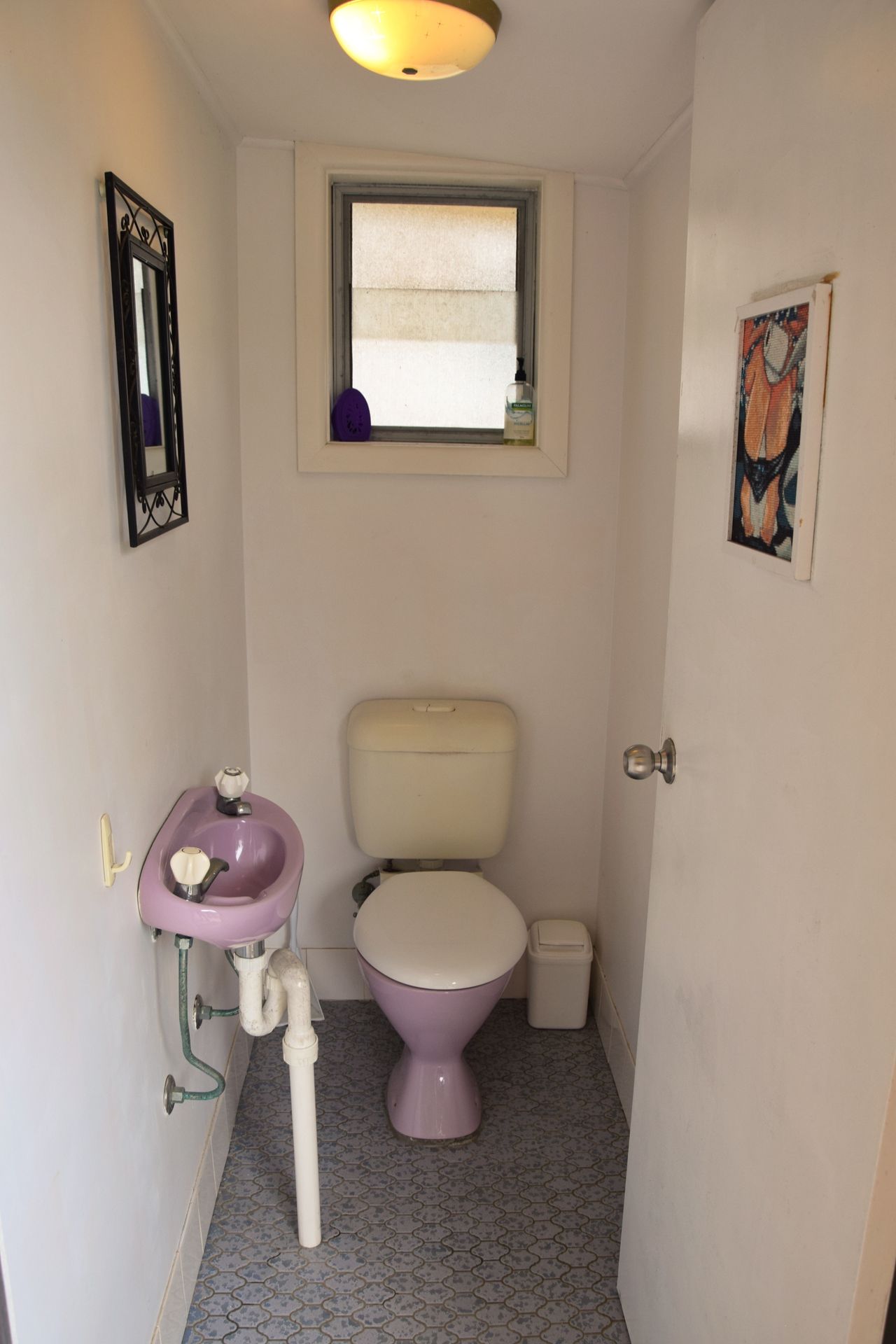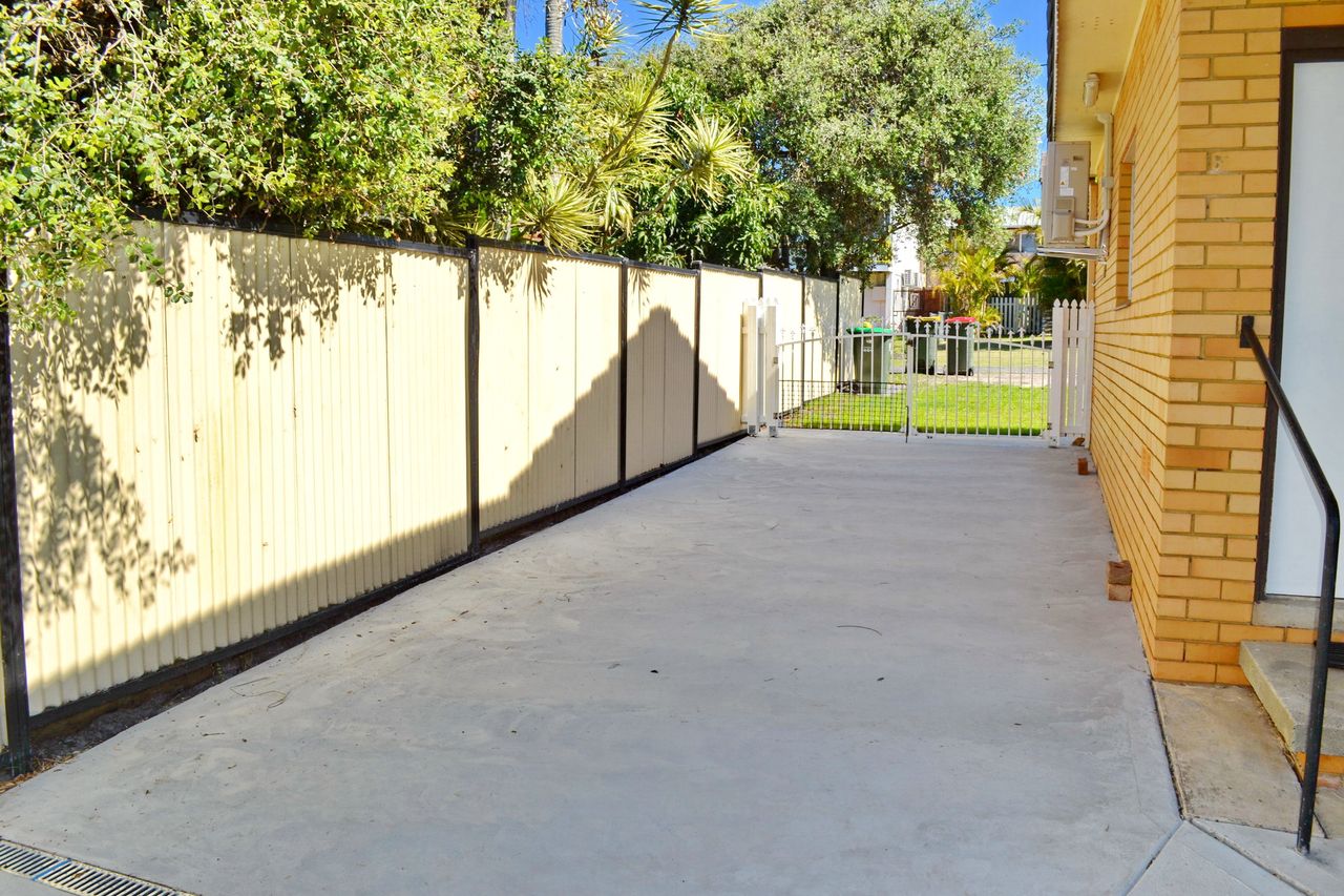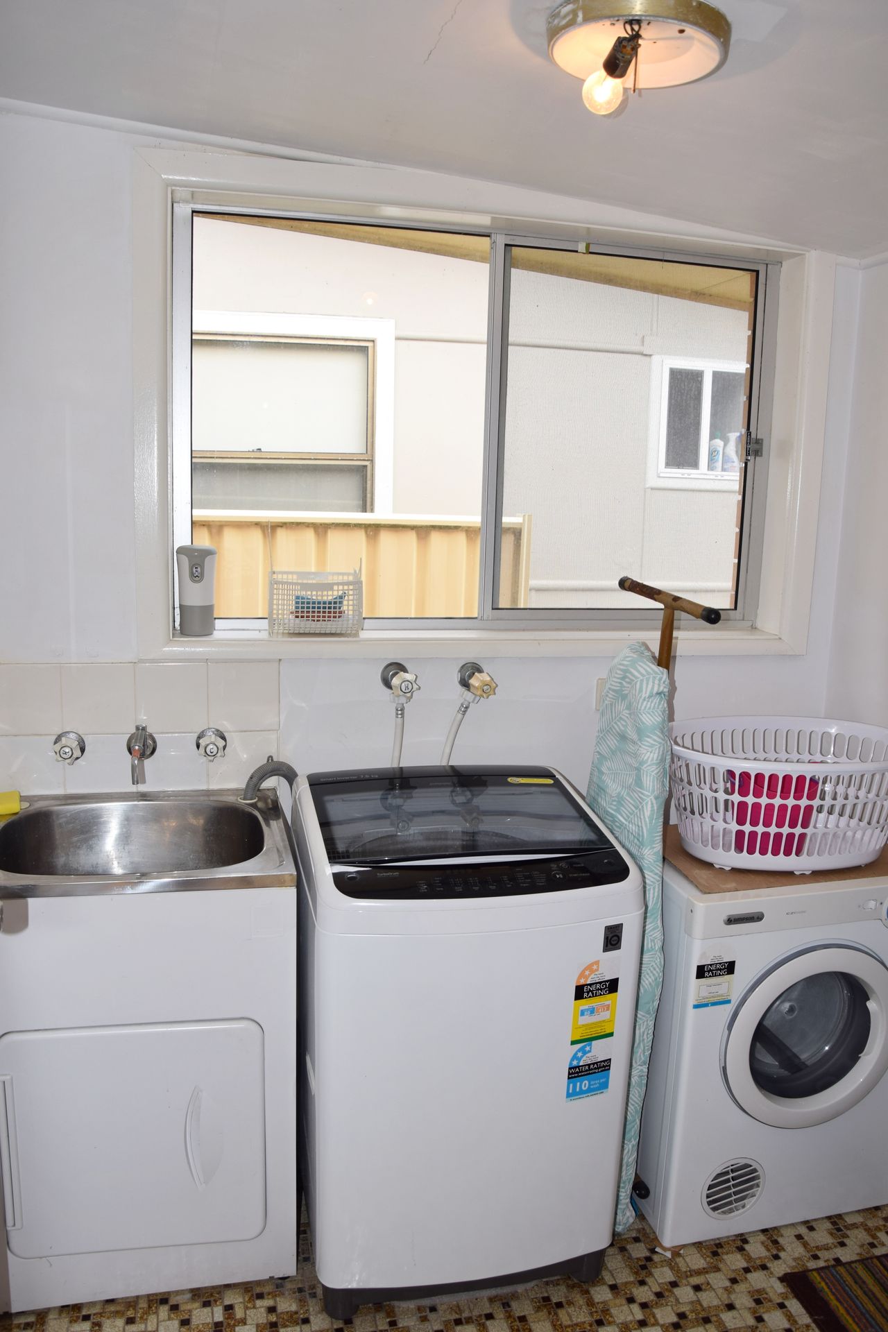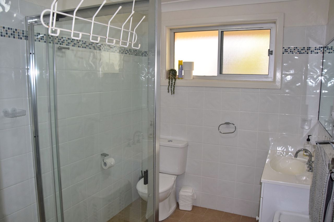The home is well-equipped with two TVs, a microwave, a washing machine, and a clothes dryer. The rear balcony, complete with a gas BBQ, overlooks a sunny, fully fenced yard with side access for a small boat. Inside, the renovated bathroom adds a fresh, modern touch. No garage available. The drive offers room for boat parking and a car.