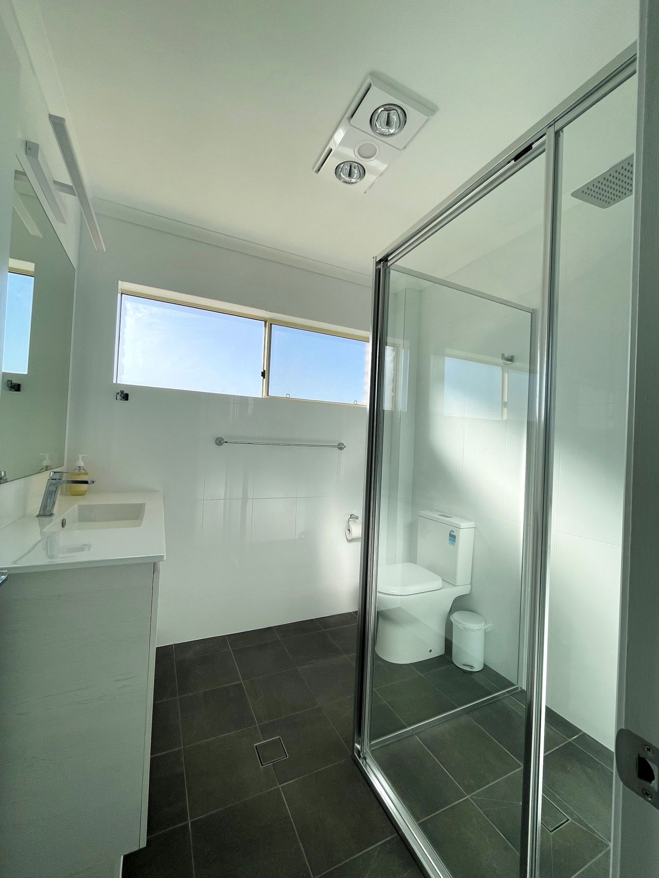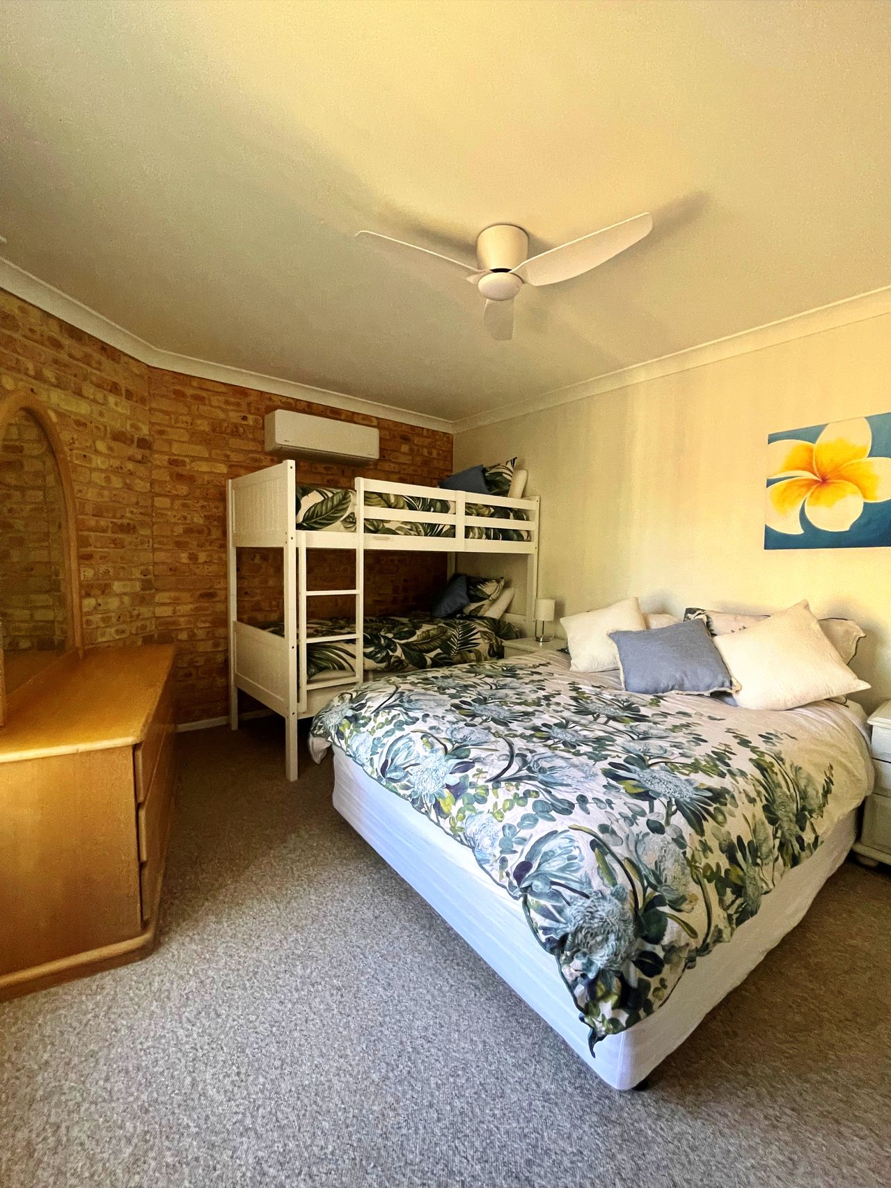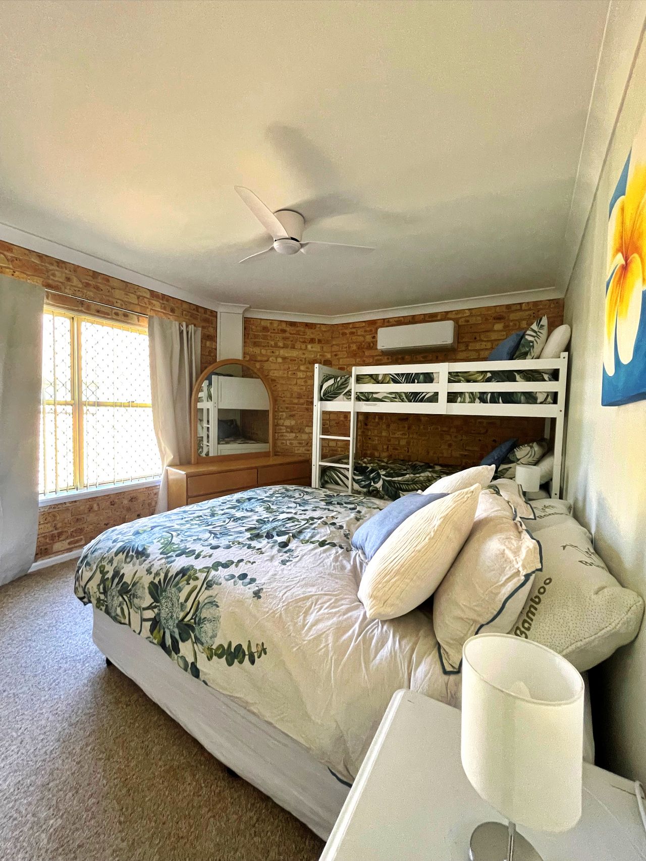The top floor or the townhouse features 2 large bedrooms, one with a queen bed and its own balcony. The second bedroom also has a queen bed and bunk beds. Both bedrooms have reverse cycle air conditioning and ceiling fans. Fall asleep listening to the waves on Main Beach. The newly renovated bathroom with both rain shower head and handheld shower head completes the top floor.