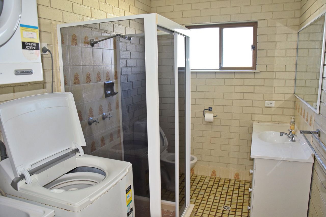 The unit is equipped with ceiling fans for added comfort, a clothes dryer, washing machine, and a shower, making it convenient for a longer stay. Secure parking is also included for your peace of mind.