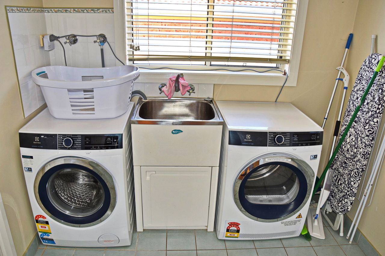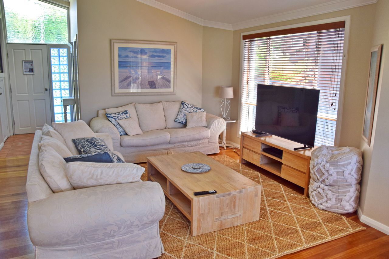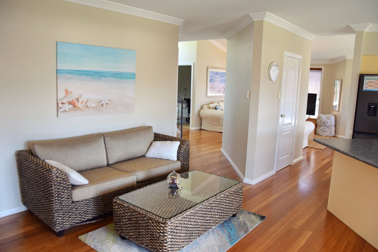 The main living area includes a smart TV, a combined dining area, and air-conditioning to keep you cool on warmer days. The well-equipped kitchen flows into a second living space—perfect for giving the kids their own area to unwind. Modern conveniences such as Wi-Fi, a dishwasher, and a separate laundry with a washer and dryer ensure a comfortable stay. A second shower and toilet are conveniently located off the laundry.