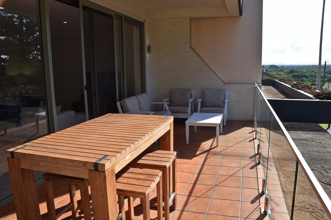 Relax on the large balcony, complete with views of Trial Bay, an outdoor lounge, dining setting, and a gas BBQ. Inside, the unit features two bedrooms, with the main bedroom offering an ensuite and an additional TV. There are also two bathrooms, a TV, DVD player, CD player, dishwasher, microwave, and a laundry with a washer and dryer for added convenience.